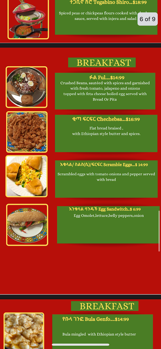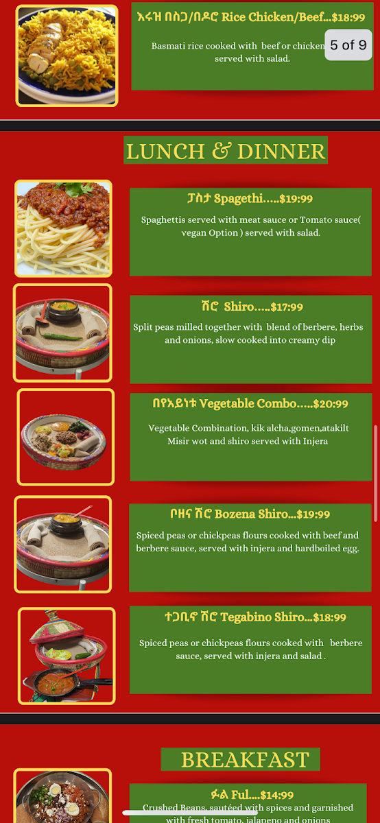 The menu is a celebration of traditional dishes, featuring generous portions that are sure to satisfy your cravings. Highlights include the irresistible Kitfo and Dulet, both praised for their quality and depth of flavor. Diners rave about the Mixed Dish plate, which showcases a delightful fusion of both meat and vegan options, all served atop freshly made injera that melts in your mouth.